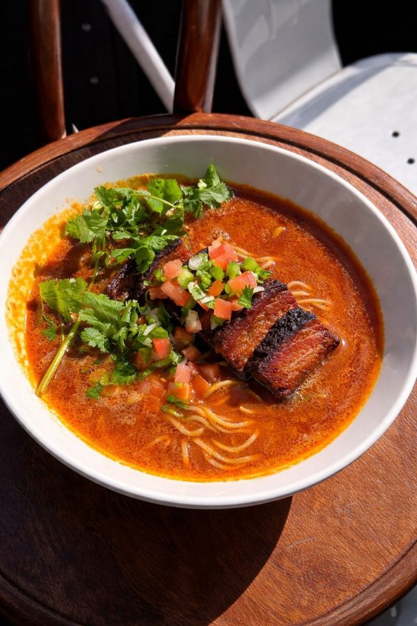 Crispy deep-fried kakuni pork served in a bold, spicy miso broth, combining miso, shoyu, and pork bone broth for a rich umami depth. Finished with fresh pico de gallo and cilantro, adding the perfect balance of crunch, heat and brightness. Curly noodles