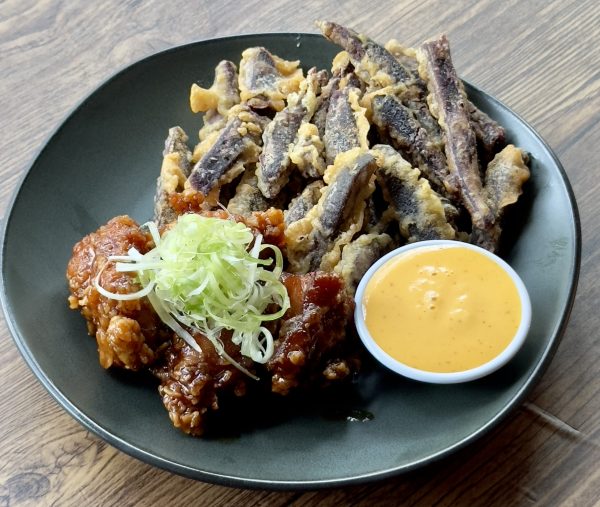 Lightly battered fried chicken, glazed with a spicy, sweet, and sour sauce. Purple yam fries seasoned with wasabi soy sauce spice. Comes with a spicy mayo dipping sauce.