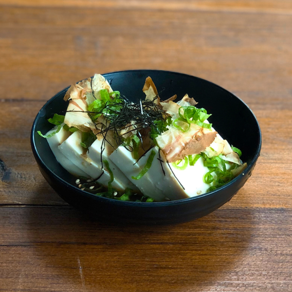 Tofu dressed with ginger, cold soba soup, and soy sauce, topped with bonito flakes, green scallions, and hari nori.