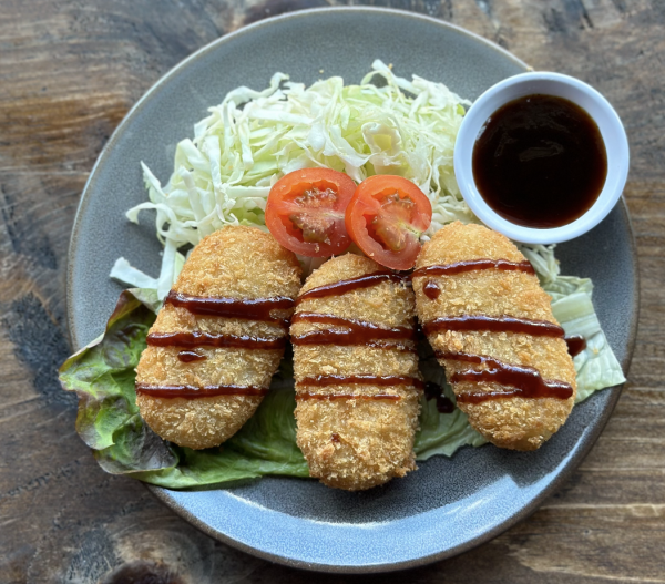 Fried oyster cream croquette, lettuce, thinly sliced cabbage, cherry tomato, tonkatsu sauce