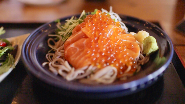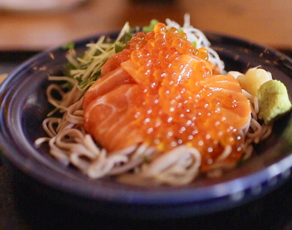 Salmon sashimi and marinated ikura (salmon roe), garnished with daikon sprouts, julienned daikon and shiso leaf.
