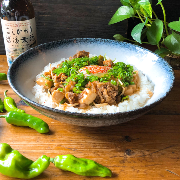 Thinly sliced beef brisket, tofu, onions, shishito peppers, enoki mushrooms. Topped with poached egg, sprinkled with togarashi and green scallions.