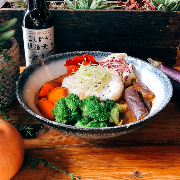 Topped with broccoli, carrots, eggplant, fukujinzuke, slaw, and black sesame seeds. Comes with a poached egg sprinkled with togarashi. (Gluten-free upon request)